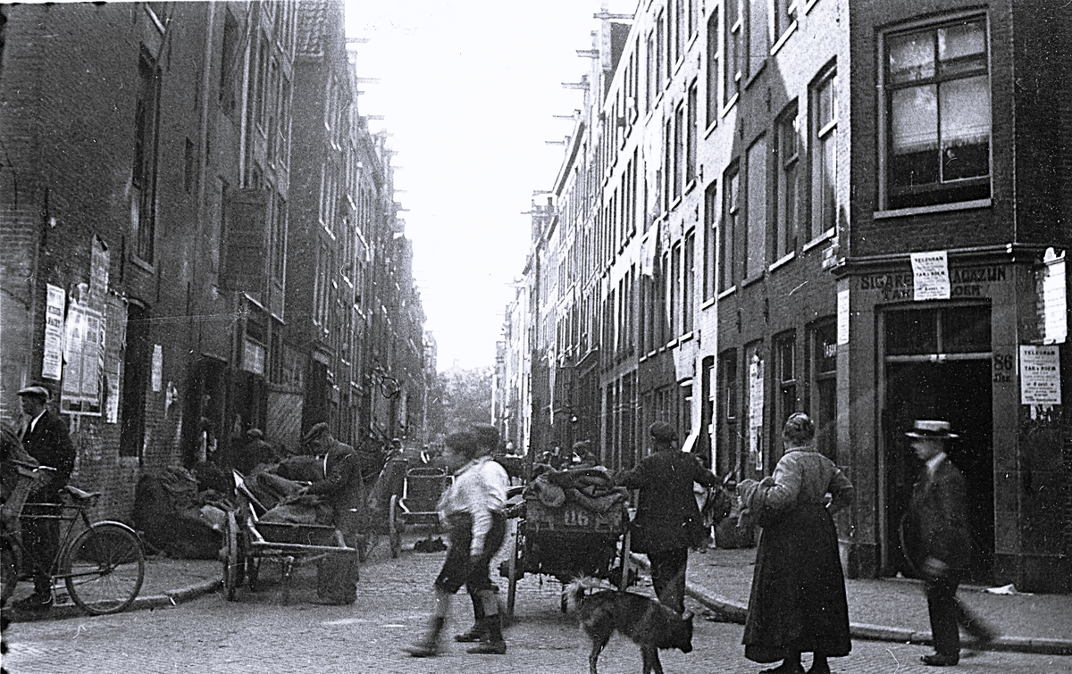 Foto av ett kvarter i, troligen Amsterdam, med människor i rörelse, 1924-25.
