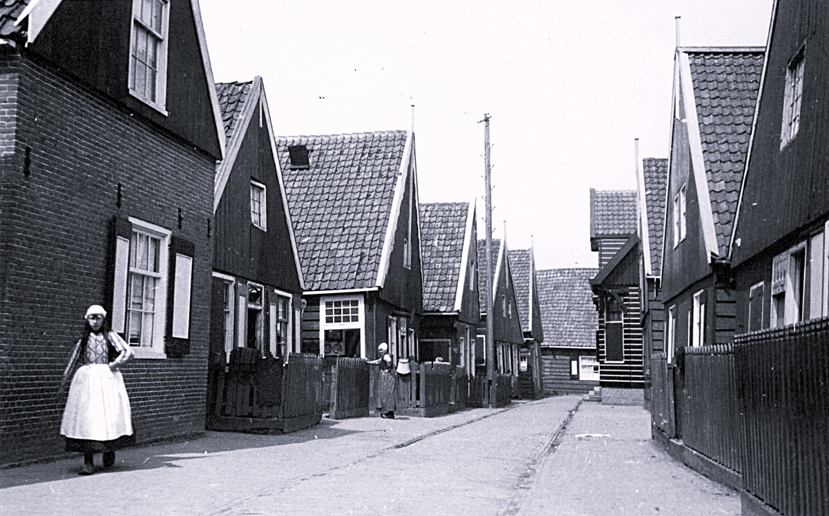 Titel: Foto av traditionell holländsk arkitektur, med sina rad-hus som kantar vattendrag och gränder, en typisk byggnadsstil som dominerade under 1900-talet, 1924-25.