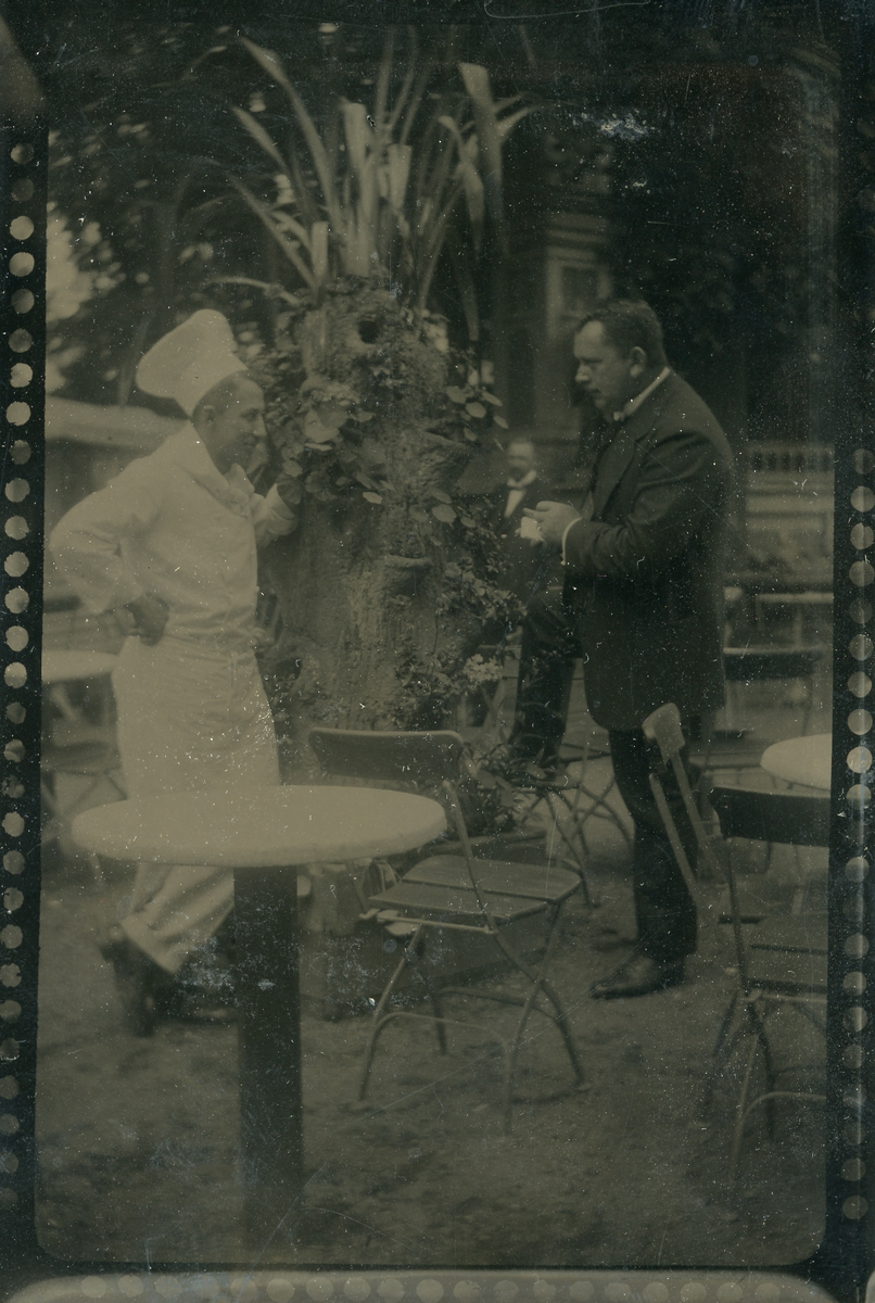 Foto av ett samtal mellan en kock och en man på en restaurang, från Karlstad (enligt text skriven i albumet).
