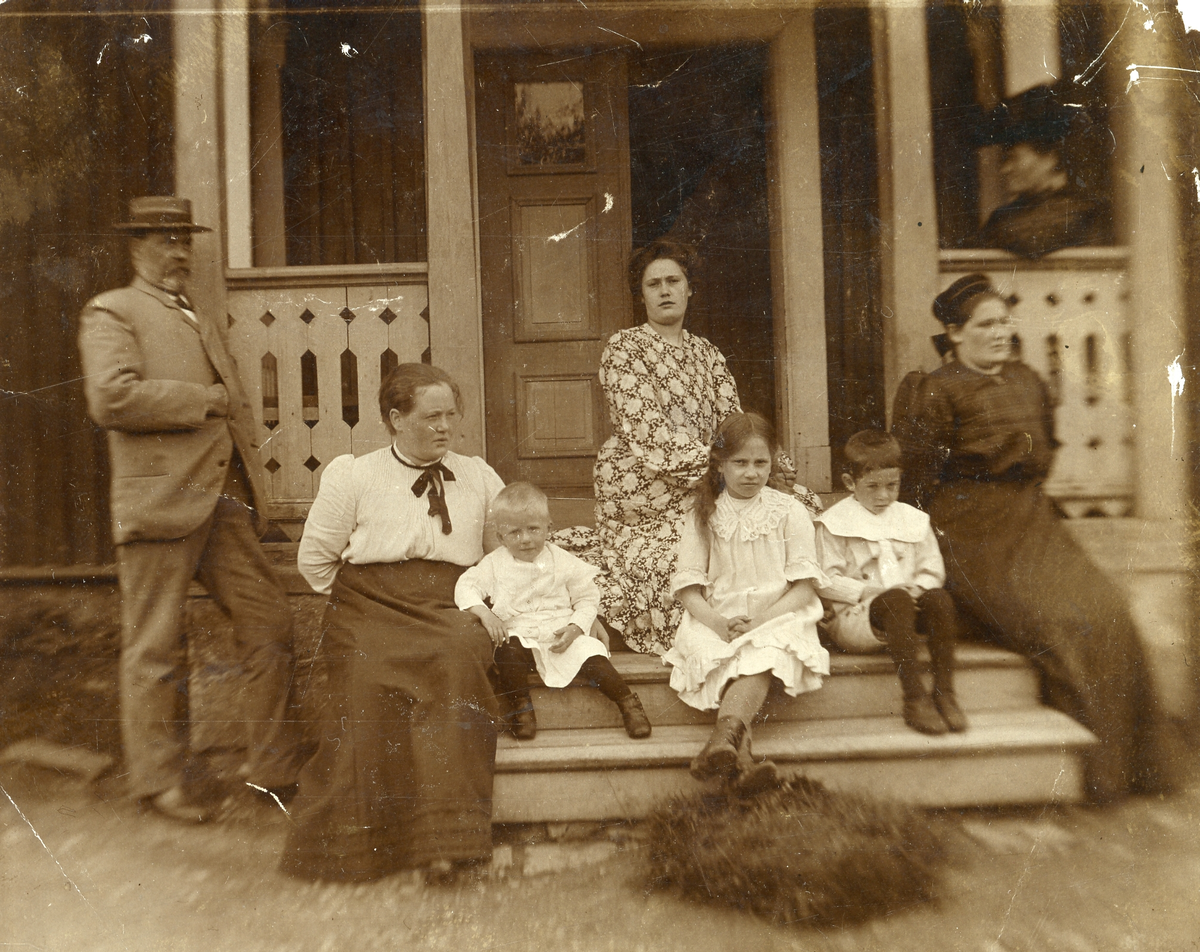 Familjeidyll från Taberg, min far och (mor på verandan) mina systrar Anna, Hilma, Maja, barnen Sixten, Gerda, Karl-Emil (enligt text skriven i albumet).