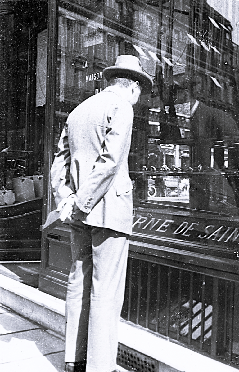 Foto av en man som står och tittar i ett skyltfönster, någonstans i Paris, 1924-25.