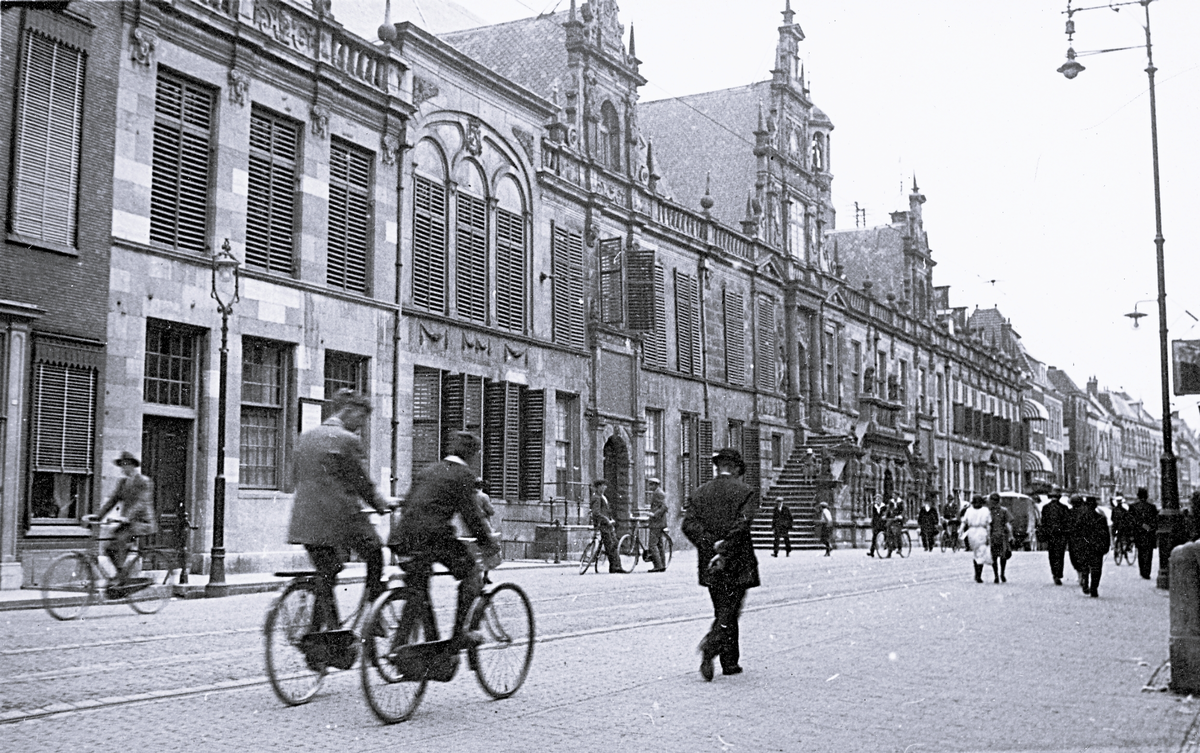 Titel: Foto av en gatuvy, troligen Paris, med byggnader och människor, varav flera cyklar, 1924-25.