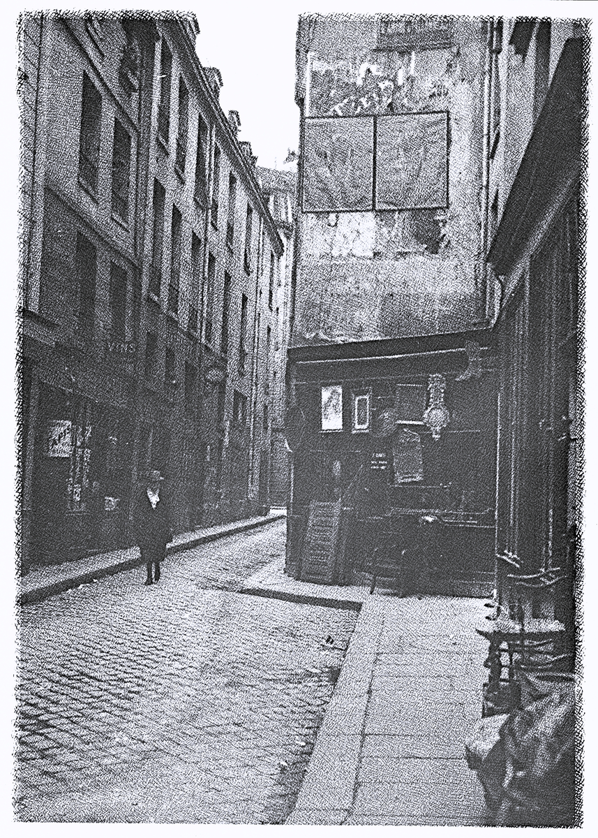 Bilden visar Rue Saint-Julien-le-Pauvre i Paris, nära Notre-Dame. Bilden visar en typisk parisisk gränd med kullerstenar och äldre byggnader, 1921.