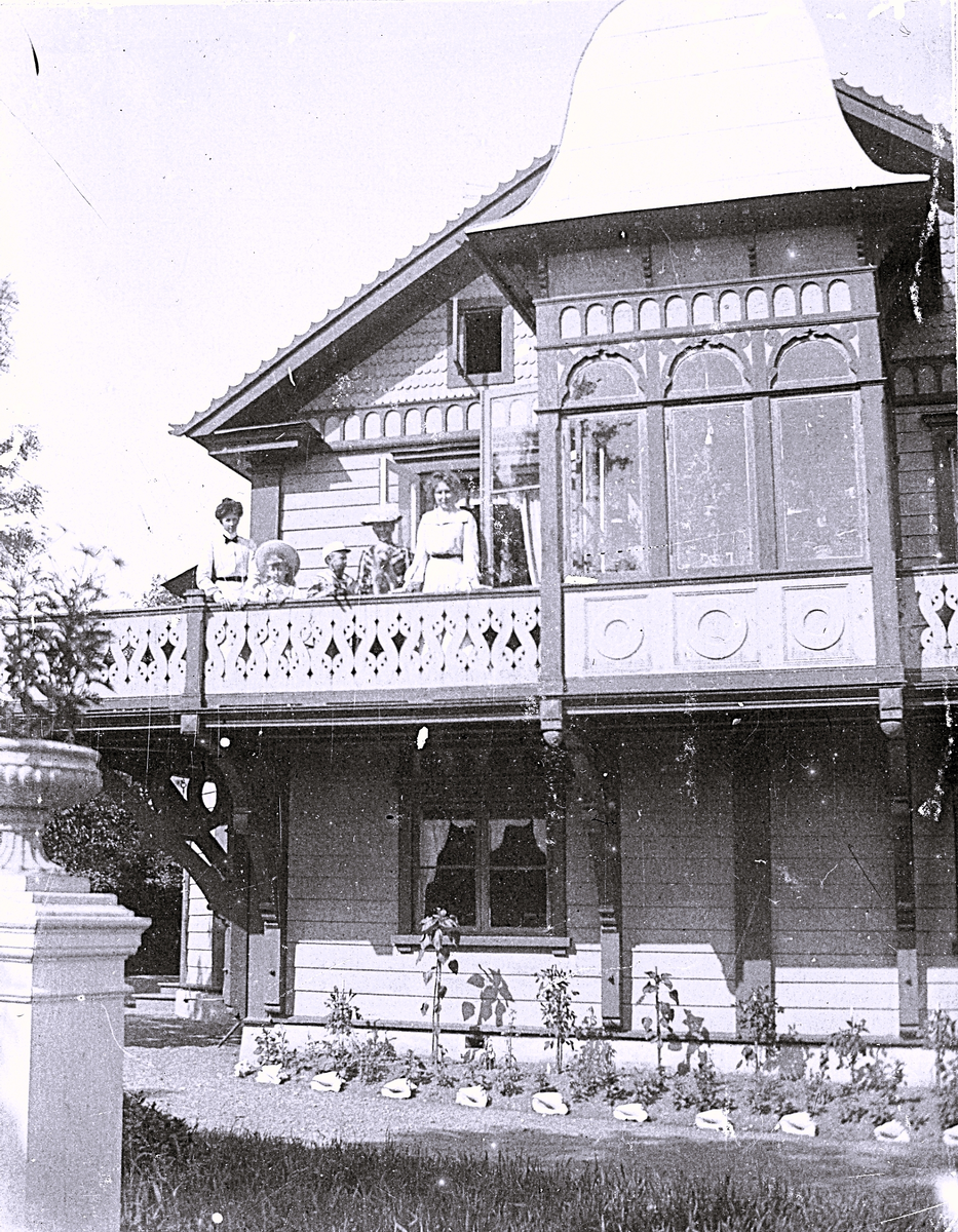 Foto av ett bostadshus med snickarglädje i varje vrå. Bildtext i album: "På morfars veranda 1903".