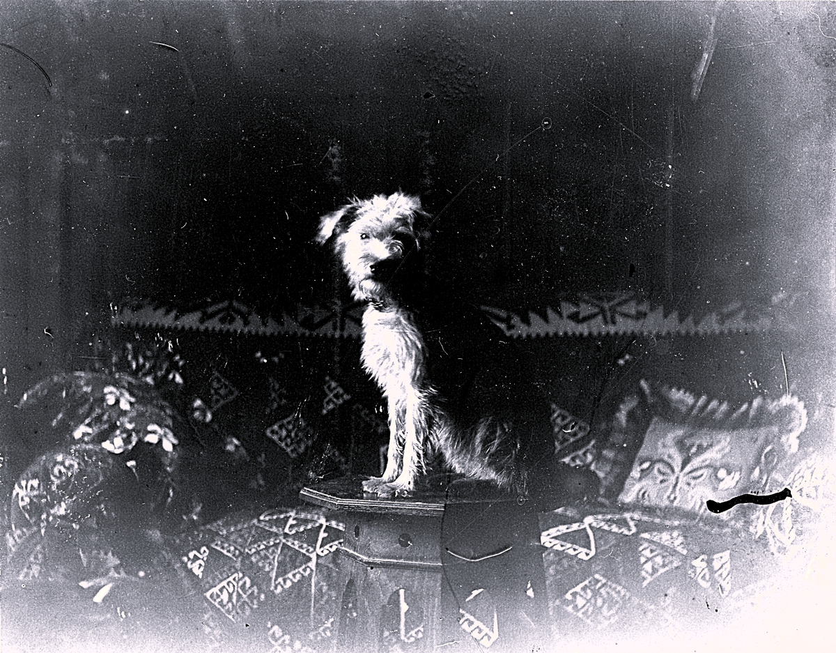 Foto av hund som sitter på en piedestal. Bildtext i album: "Hobby looking at?".