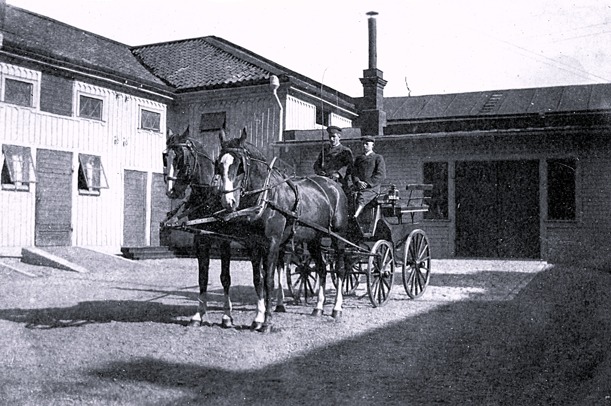 Foto av hästekipage med två män i vagnen. Bildtext i album: "Ready to start!".