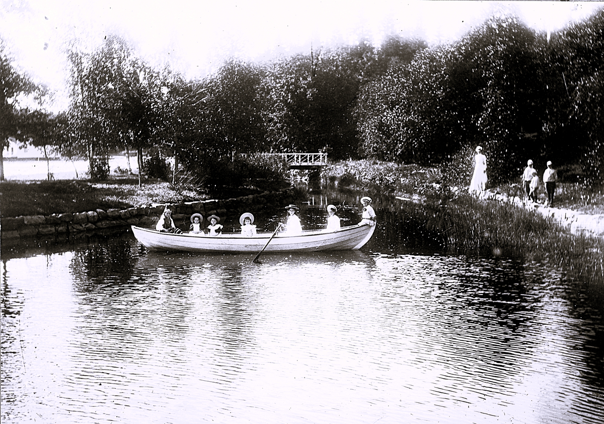 Foto av en stor eka med barn och vuxna i. Bildtext i album: "Vid kanalen, 1902".