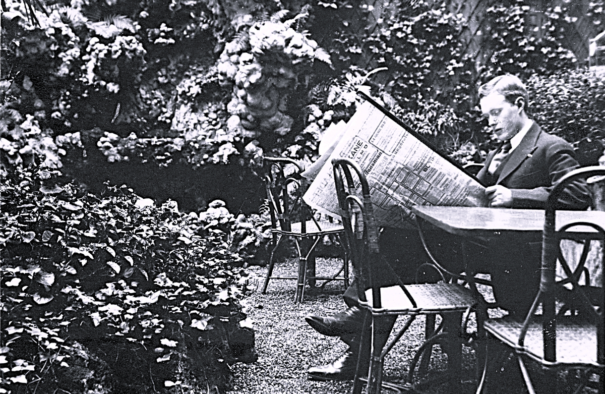 Titel: Foto av troligen tandläkare Gunnar Högberg sittande i en trädgård läsande en tidning. Paris 1921.