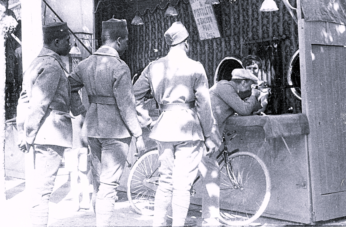 Titel: Foto av några män i uniform som väntar på sin tur att få skjuta ner saker i ett tivoli-stånd samt en man med cykel som prövar sin lycka någonstans på franska atlantkusten, 1924-25.