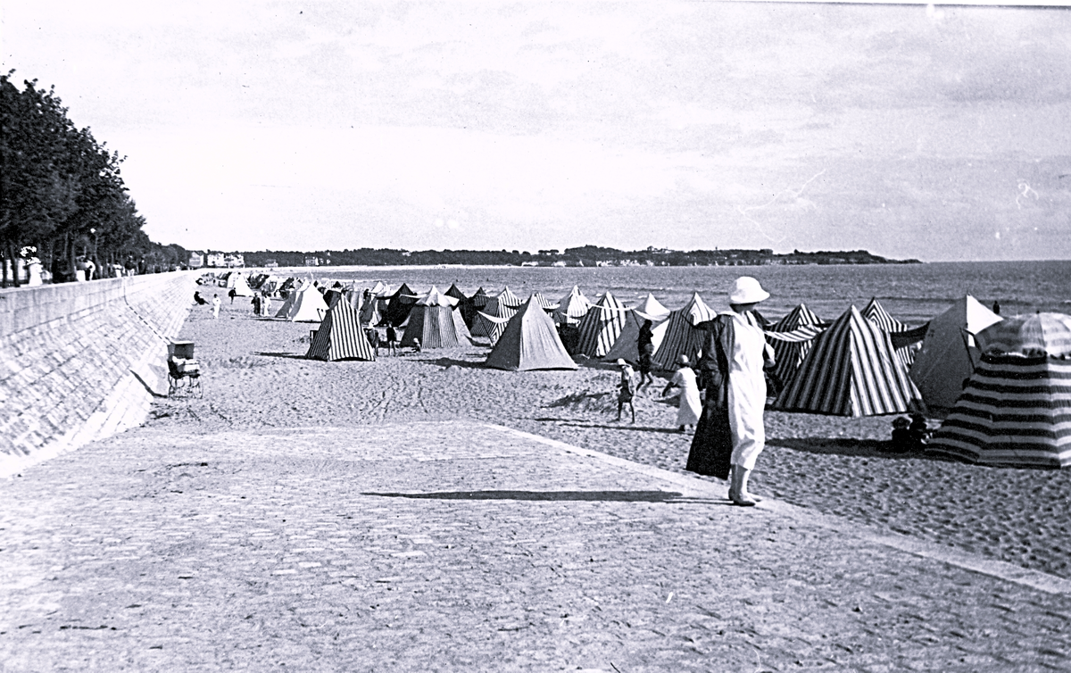 Titel: Foto av en strand i Bretagne med de många strandhytterna som syns och var vanligt vid franska badorter förr i tiden, 1924-25.