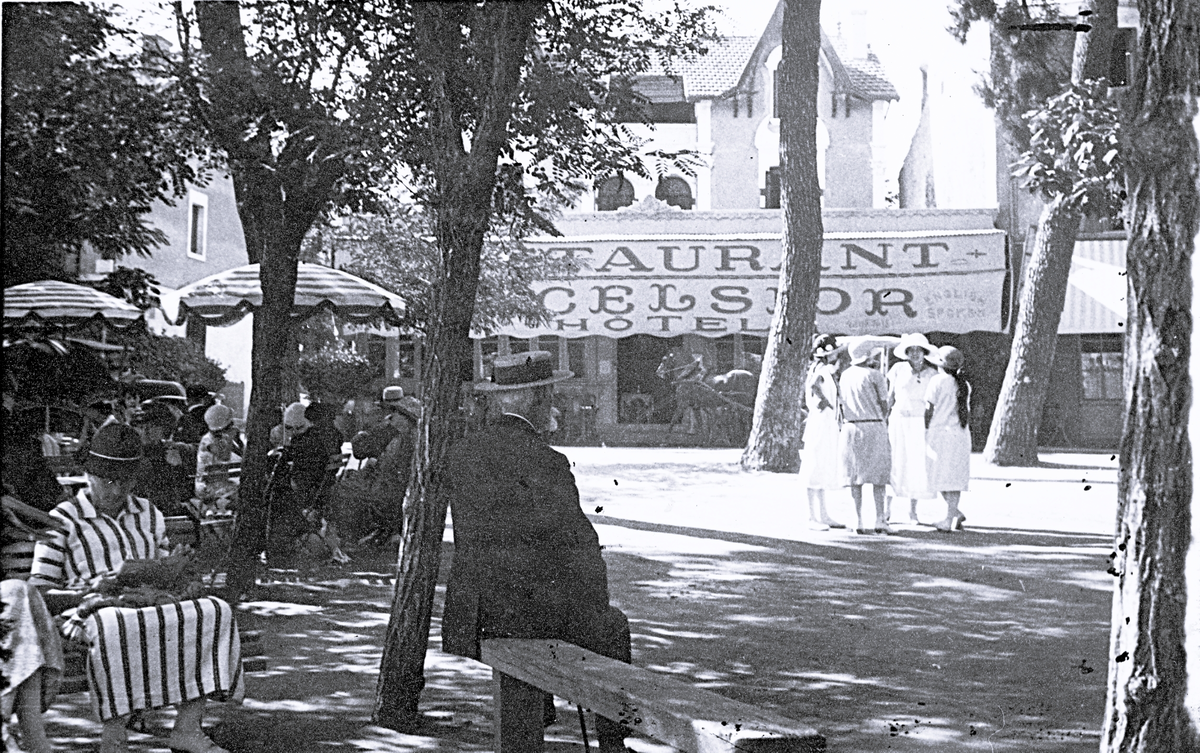 Foto av en gata med människor och byggnader. I förgrunden syns träd och i bakgrunden en byggnad med texten "RESTAURANT" och "HOTEL" på fasaden, troligen någonstans på franska atlantkusten, 1924-25.
