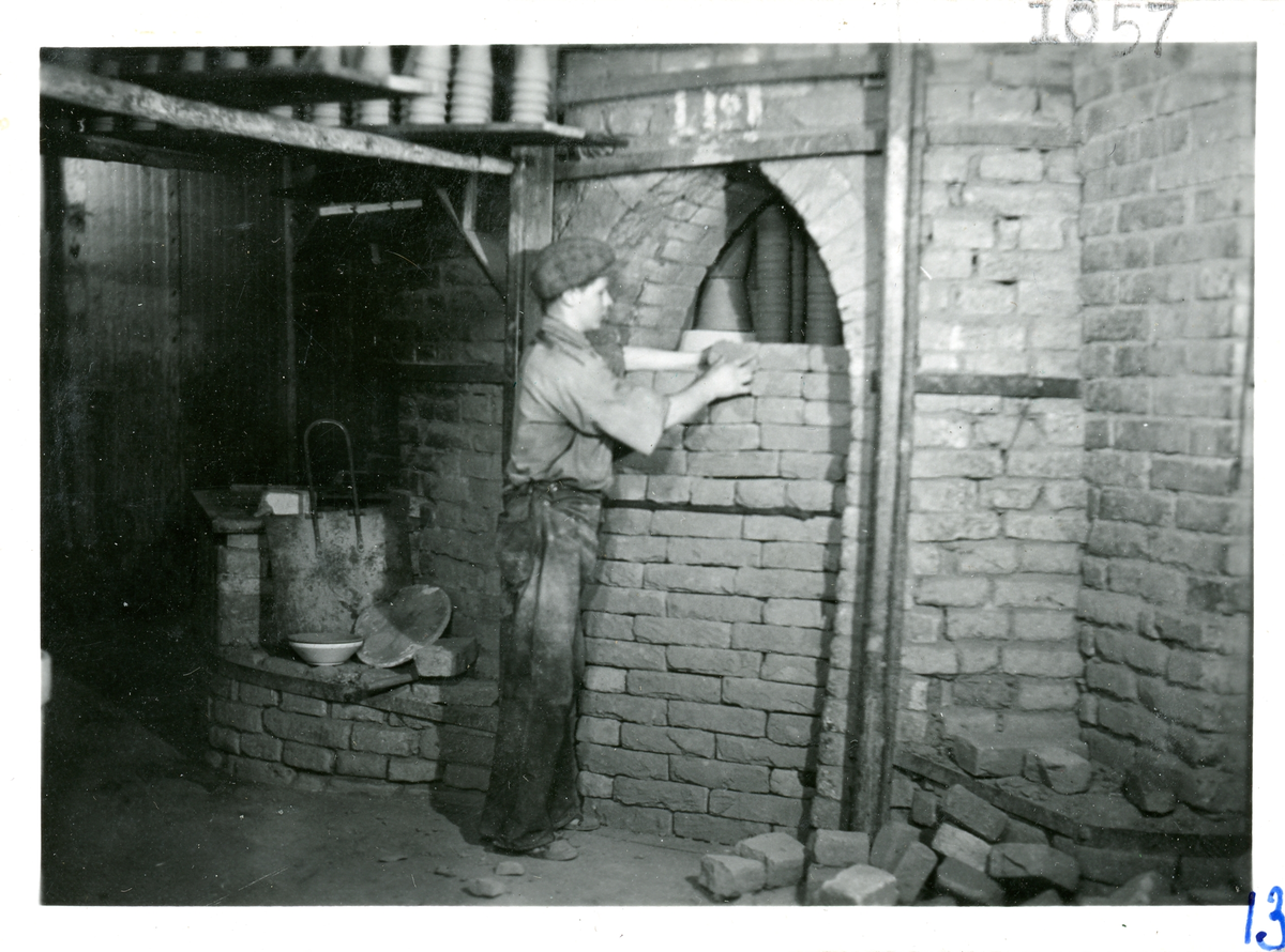 Bild från tillverkningen på Bo Fajans. Igenmurning av en rundugn med tegelstenar inför bränning.