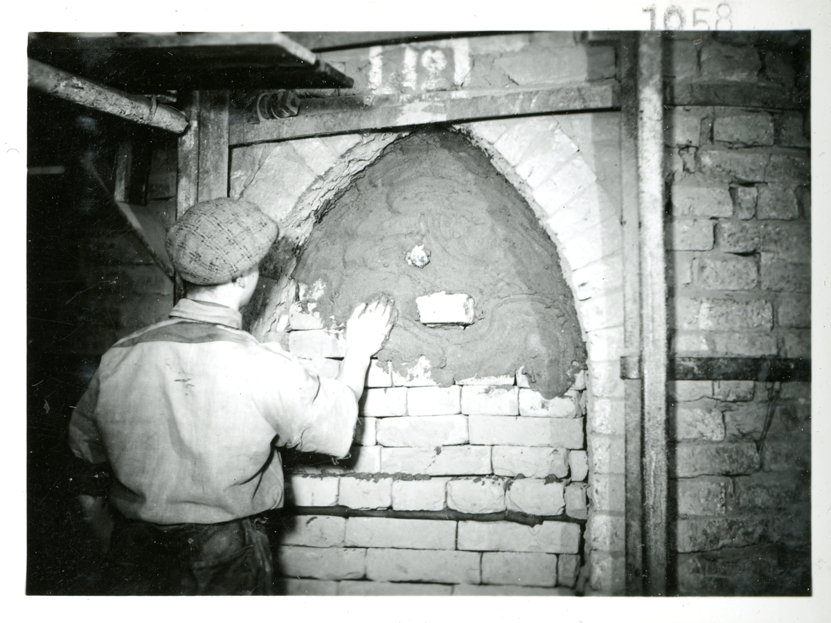 Bild från tillverkningen på Bo Fajans. Igenmurning av en rundugn med lera inför bränning.