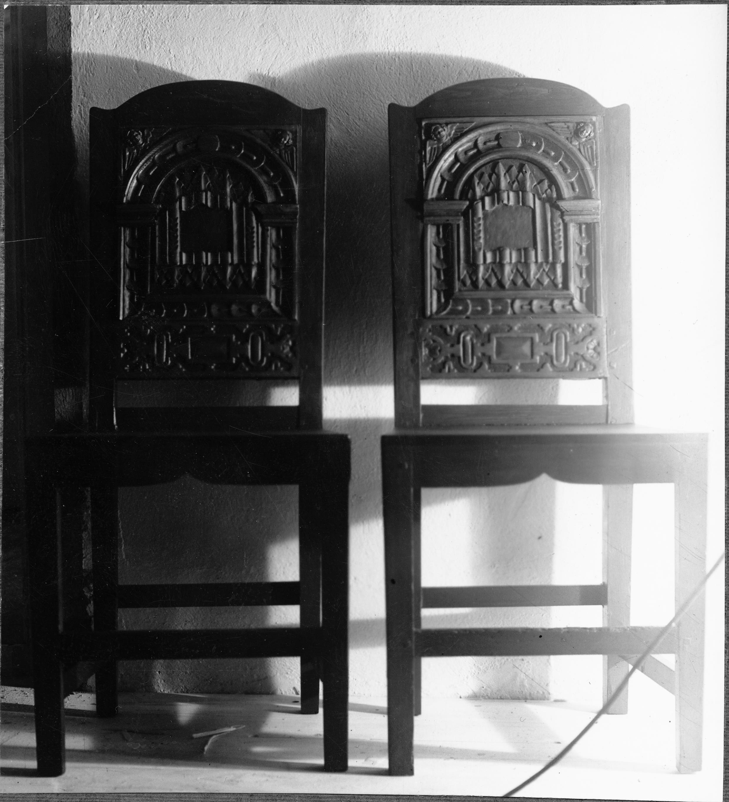 Stolar, ett par, ryggfält av ek, 1600-talet, övriga delar av furu, 18-1900-talet. Efter behandlingen 1951.