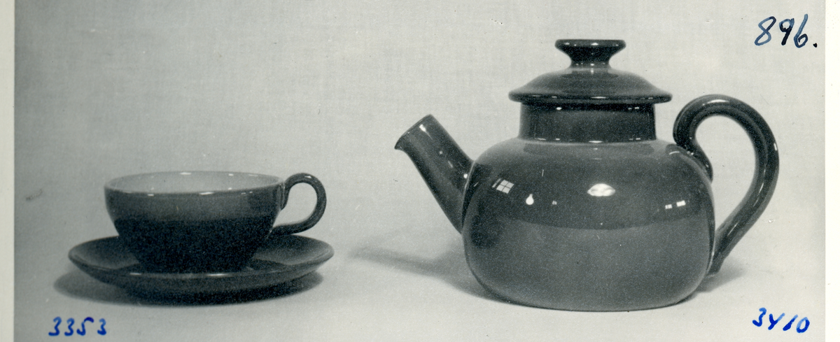 Tekopp med fat och tekanna från Bo Fajans, formgivare Eva Jancke-Björk, 1900-talets mitt.