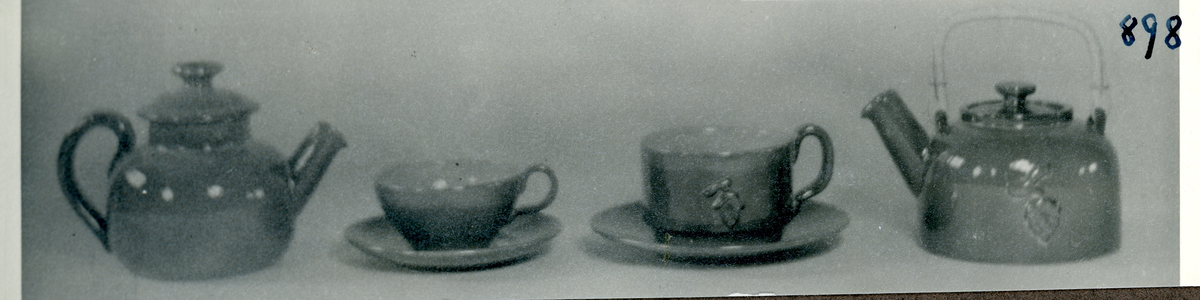 Tekanna och tekopp från två olika servicer från Bo Fajans, den med relief formgiven av Eva Jancke-Björk, 1900-talets mitt.