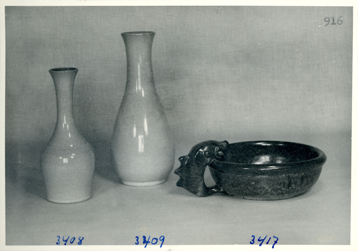 Vaser och skål med hänkel från Bo Fajans, formgivare Eva Jancke-Björk, 1900-talets mitt.
