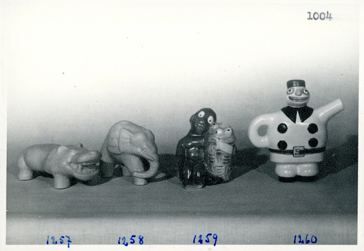 Tre figurer och en flaska från Bo Fajans, formgivare Allan Ebeling, tidigt 1900-tal. Flodhäst, elefant, XXXX, flaska.