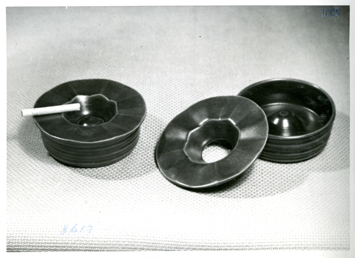 Två askkoppar, varav en är öppnad, från Bo Fajans, formgivare Eva Jancke-Björk, 1900-talets mitt.