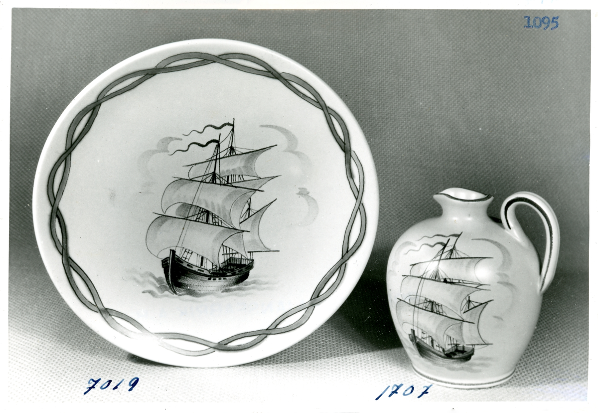 Fat och krus från Bo Fajans, formgivna av Eva Jancke-Björk respektive Allan Ebeling samt dekorerade av Gösta Holmstrand, 1900-talets mitt.