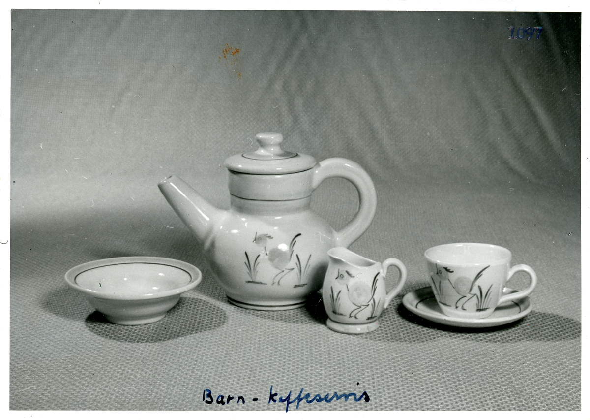 Barnkaffeservis med påskdekor från Bo Fajans, 1900-talets mitt. Skål, kanna, gräddkanna, kopp med fat.