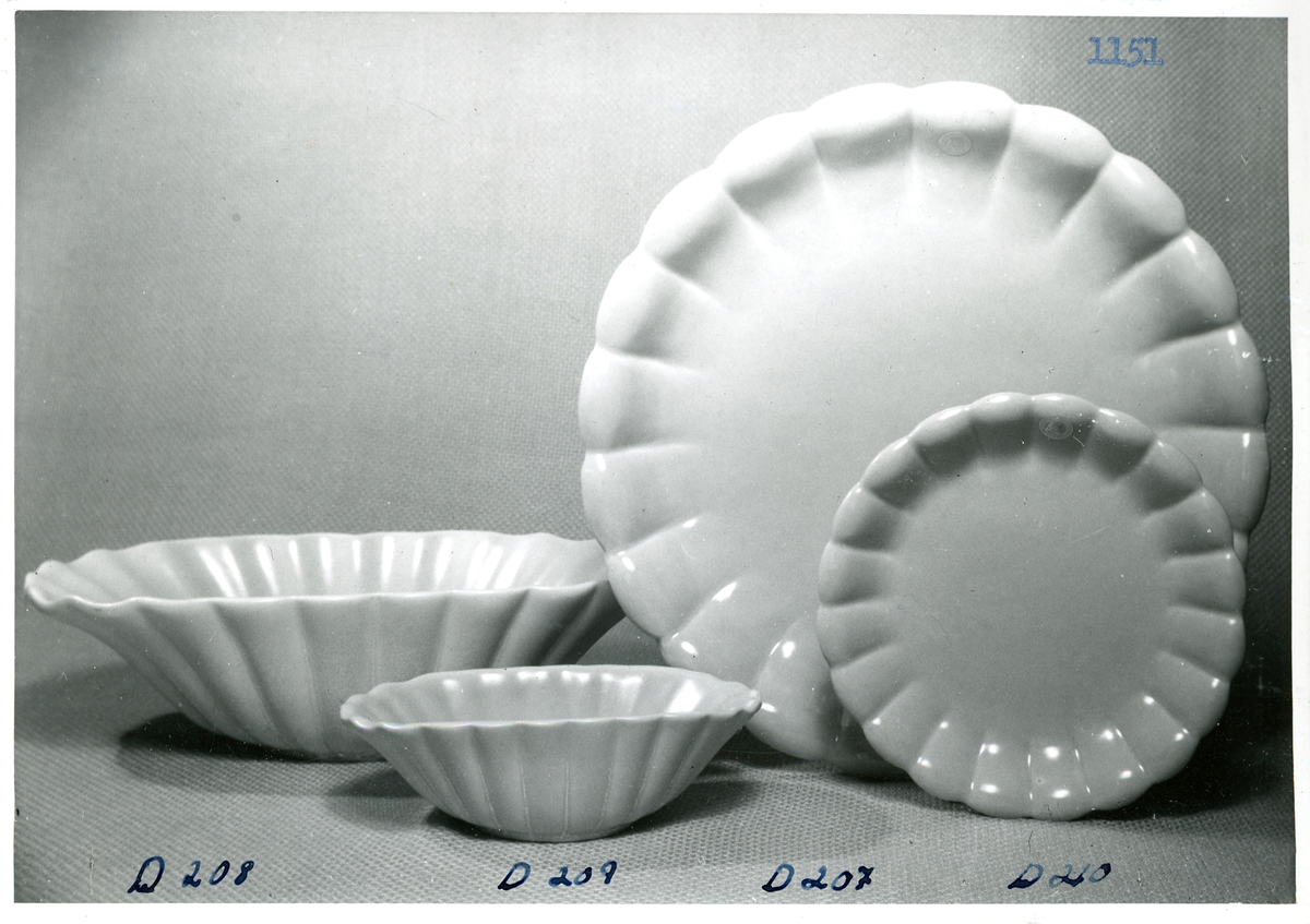 Skålar, fat och assiett från Bo Fajans, formgivare Ewald Dahlskog, 1900-talets mitt.