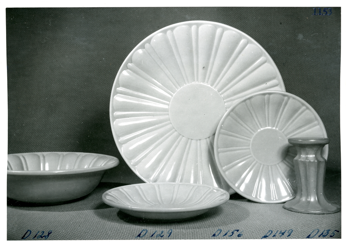 Fat, assietter samt ljusstake från Bo Fajans, formgivare Ewald Dahlskog, 1900-talets mitt.