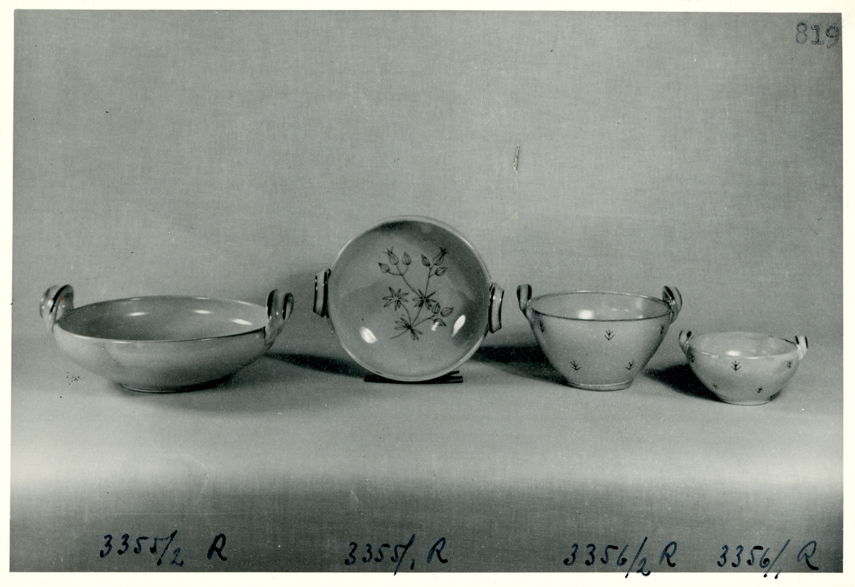Skålar med R-dekor från Bo Fajans, formgivare Eva Jancke-Björk, 1900-talets mitt.