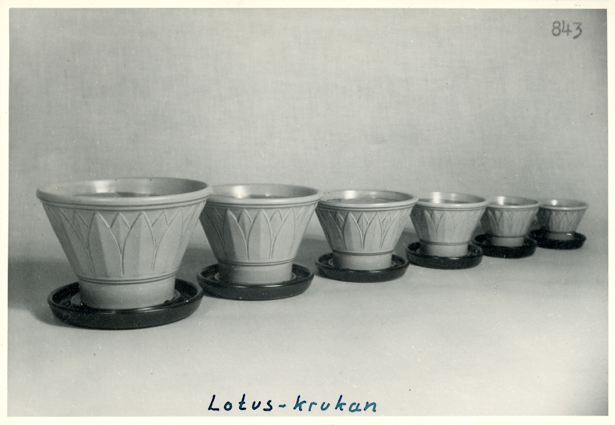 Lotus-krukan i olika storlekar från Bo Fajans, formgivare Ewald Dahlskog, 1900-talets mitt.