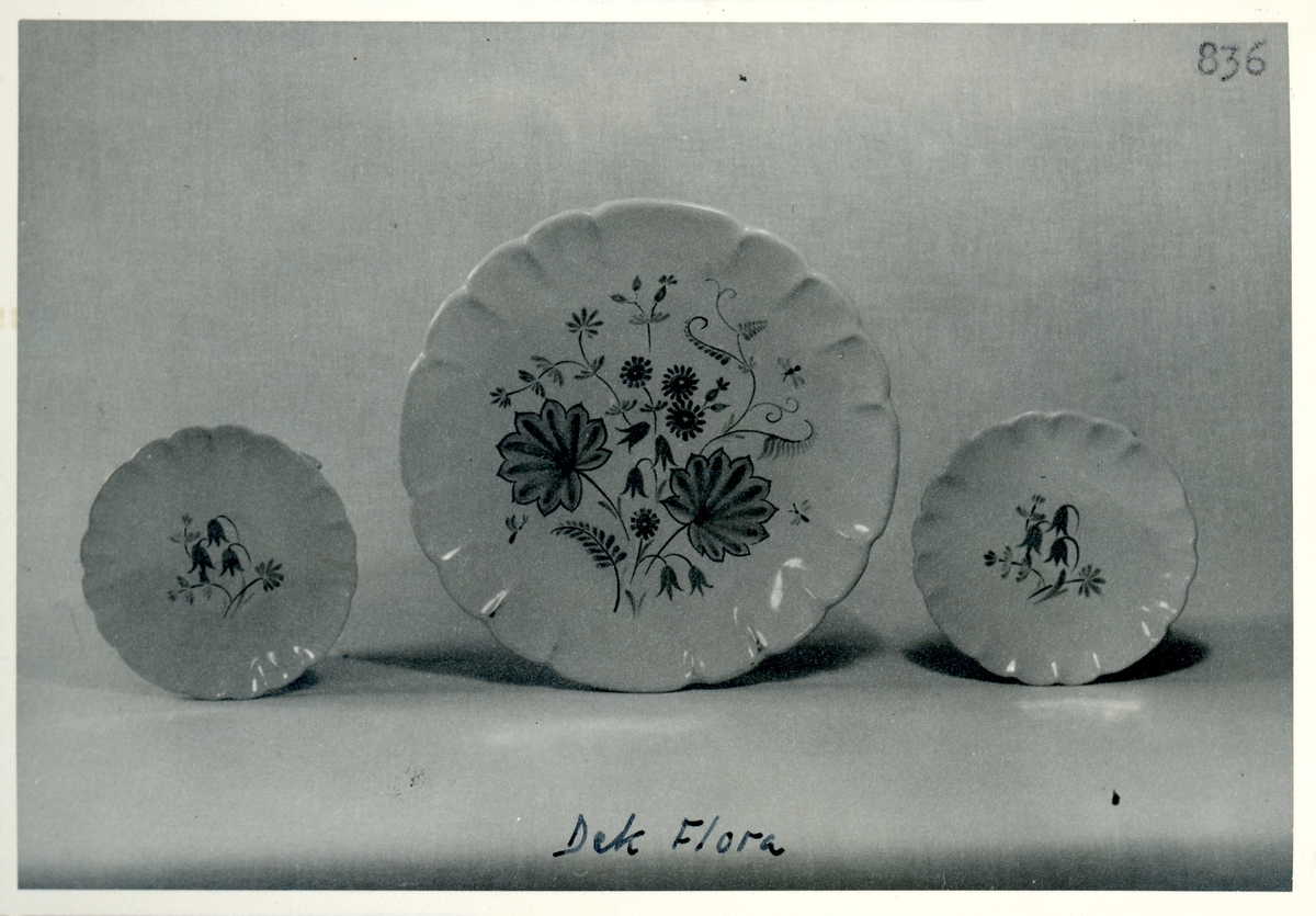 Fat och assietter från Bo Fajans, formgivare Allan Ebeling, tidigt 1900-tal. Dekor Flora.