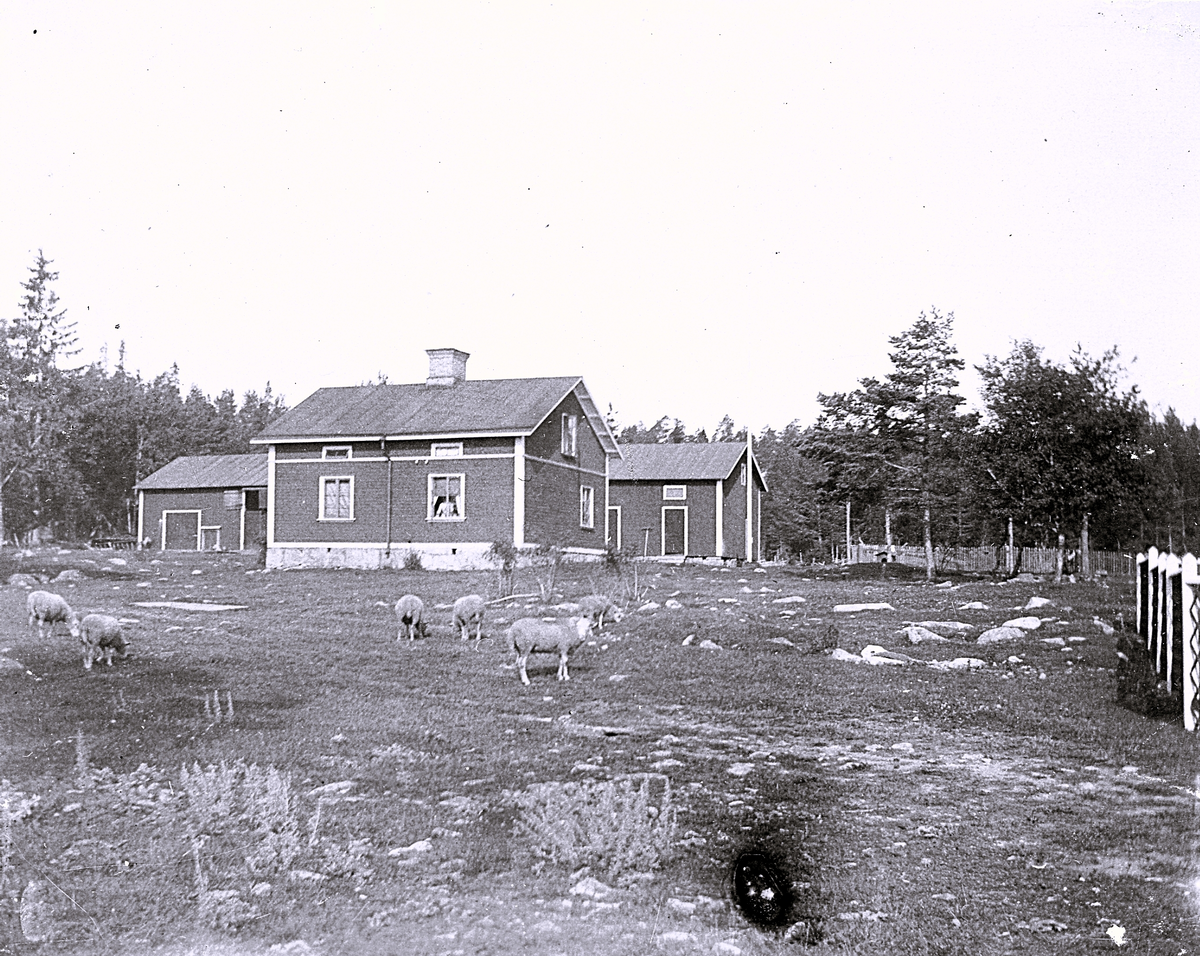 Titel: Foto av lantlig bild med får och bostadsbyggnad. Bildtext i album: "Gröndal med fåren! ".