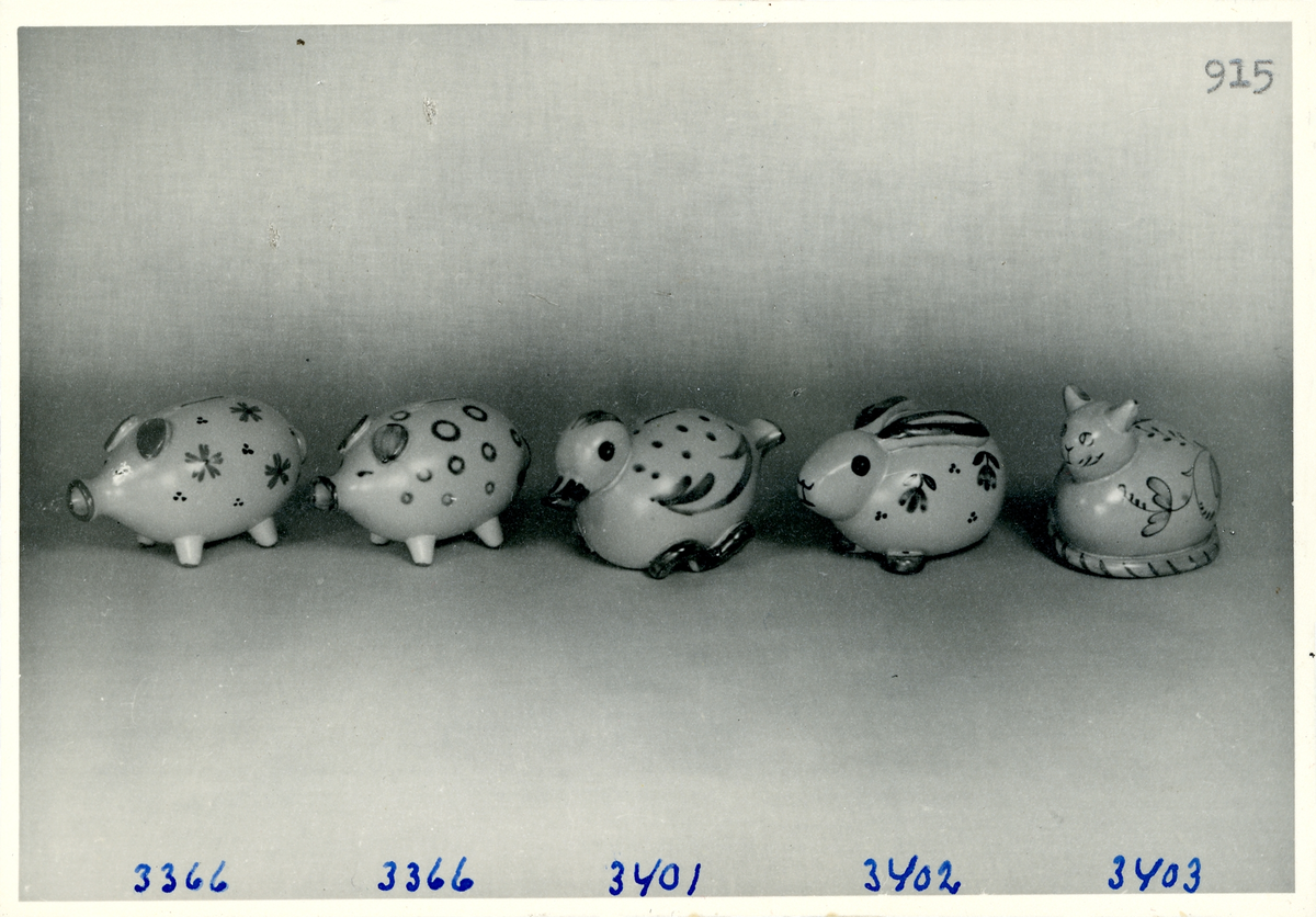 Sparbössor/Spargrisar från Bo Fajans, formgivare Eva Jancke-Björk, 1900-talets mitt. Grisar med olika dekor, anka, kanin och katt.