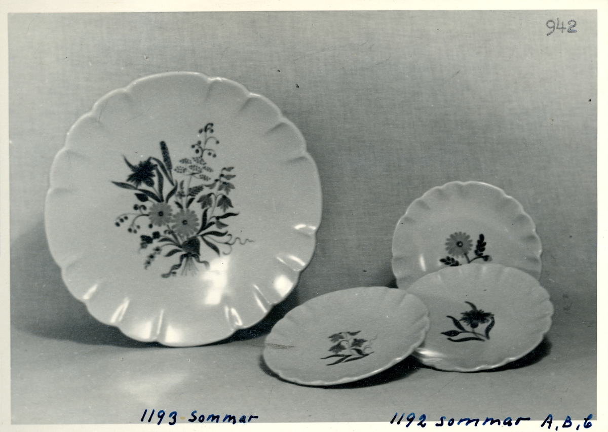 Fat och tre assietter i dekor Sommar från Bo Fajans, formgivare Allan Ebeling, tidigt 1900-tal.
