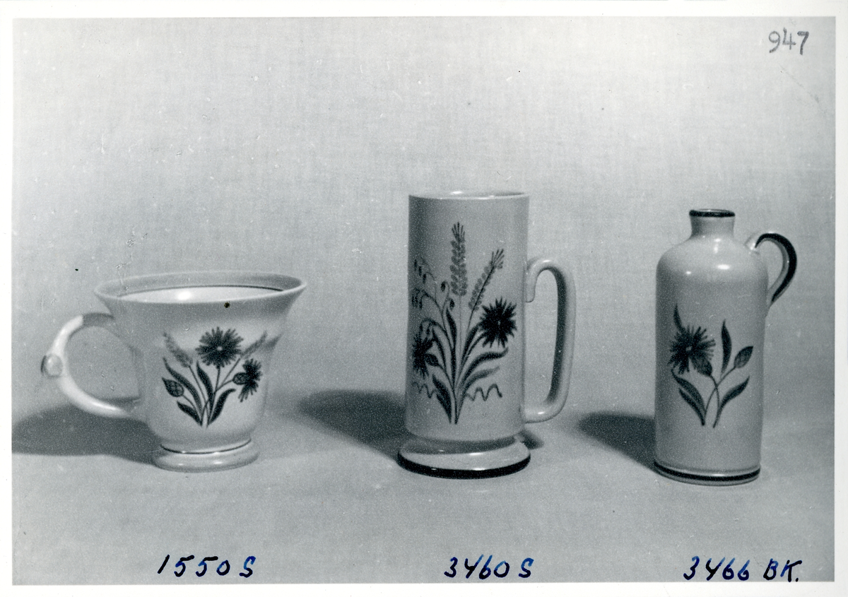 Vaser med olika dekorer från Bo Fajans, formgivna av Allan Ebeling och Eva Jancke-Björk, 1900-talets mitt.