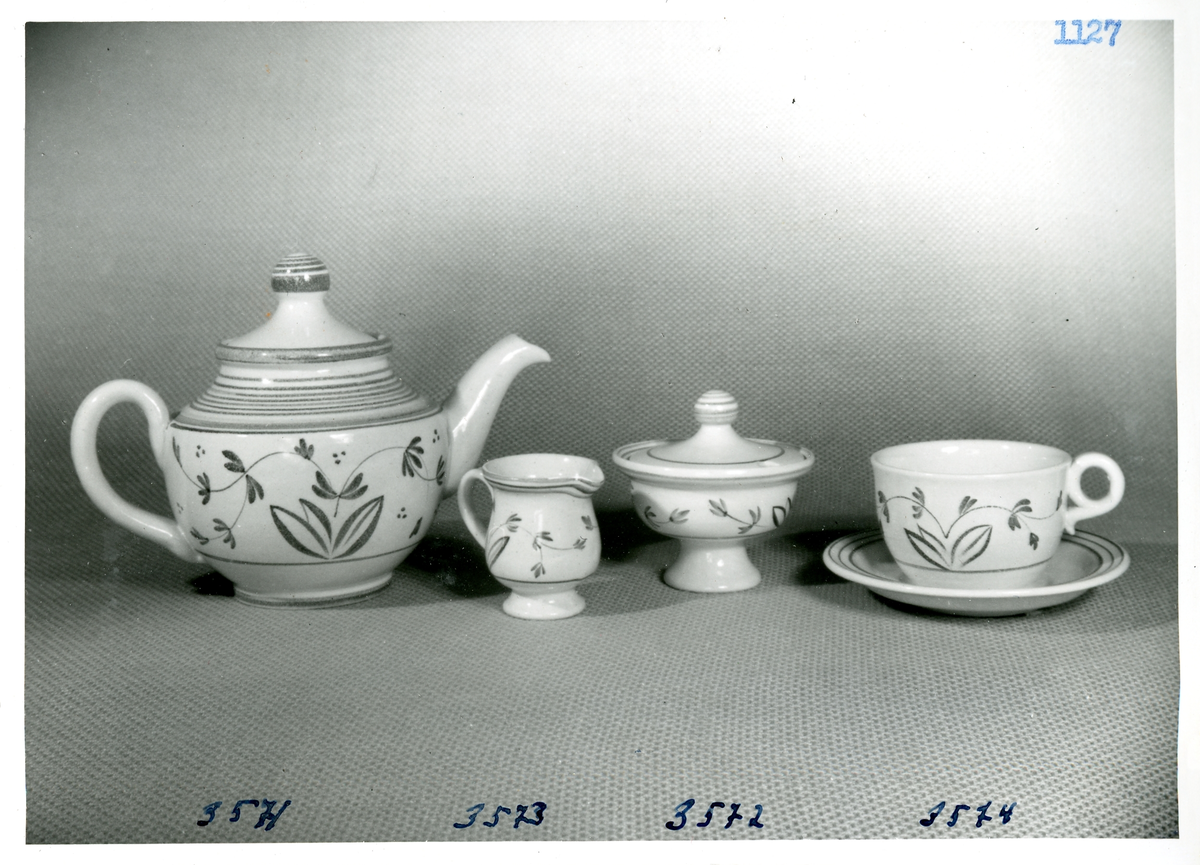 Titel: Teservis i G-dekor (vit glasyr med grön eller rödbrun dekor) från Bo Fajans, formgivare Eva Jancke-Björk, 1900-talets mitt.