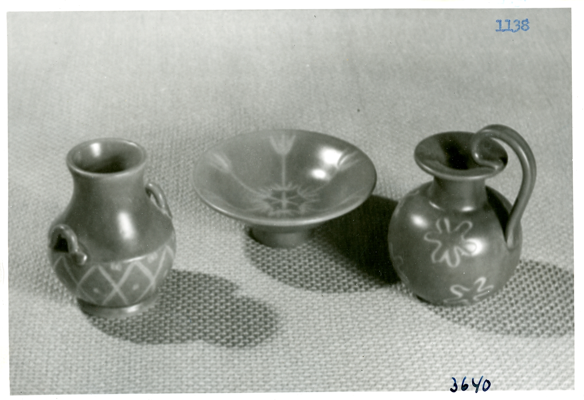 Krus, skål och vas med ristad dekor från Bo Fajans, formgivare Eva Jancke-Björk, 1900-talets mitt.