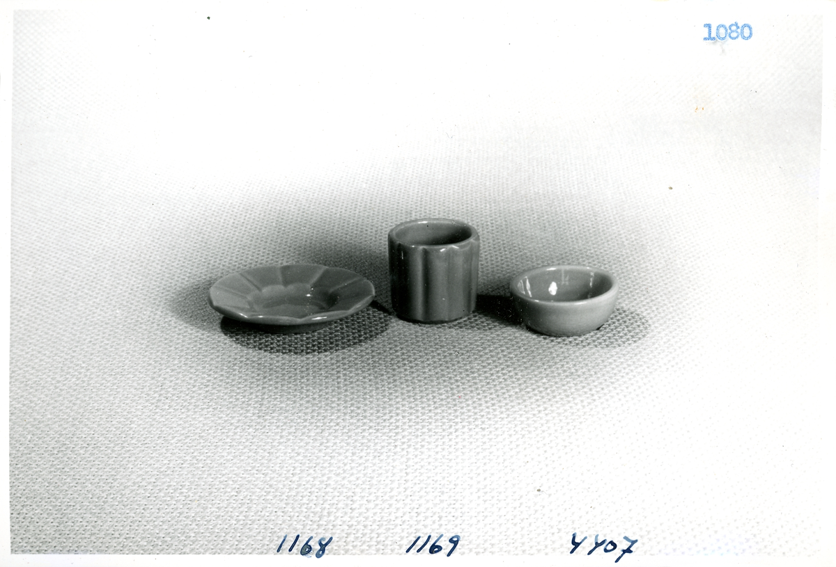 Bägare, askfat och askkopp från Bo Fajans, formgivna av Allan Ebeling och Eva Jancke-Björk, tidigt 1900-tal.
