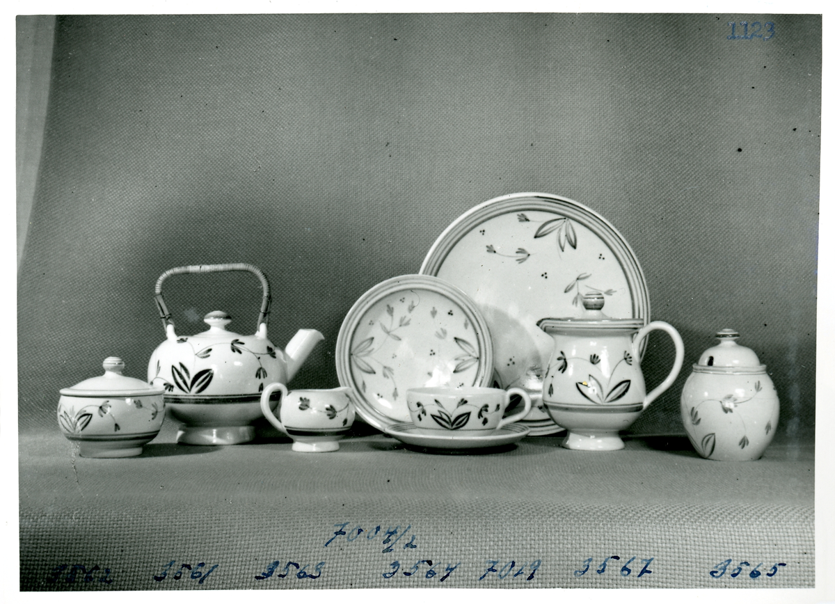 Titel: Teservis i G-dekor (vit glasyr med grön eller rödbrun dekor) från Bo Fajans, formgivare Eva Jancke-Björk, 1900-talets mitt.