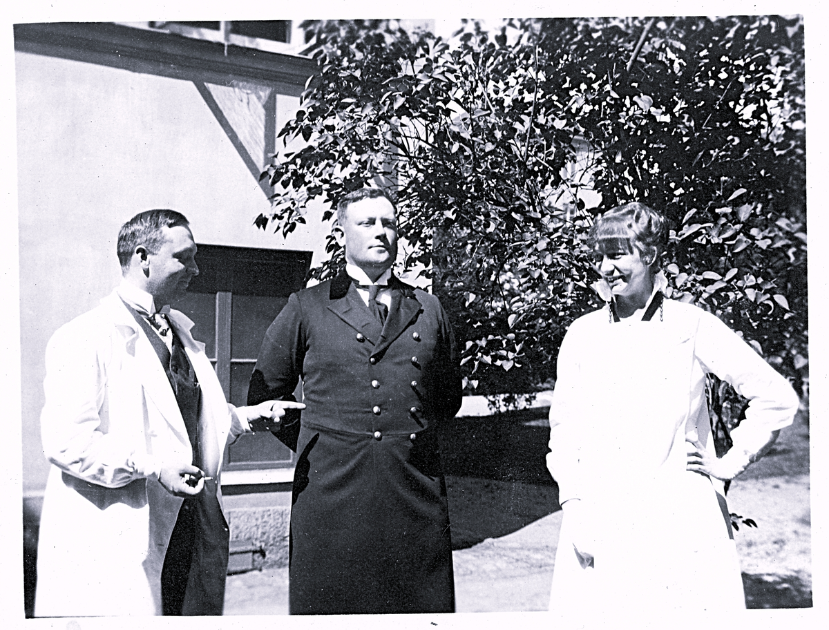 Foto av Ingrid Welander (f. Lagerholm) och två män i arbetskläder vid Sabbatsberg. Bildtext i album: "Pip! _ _ våren 1916".