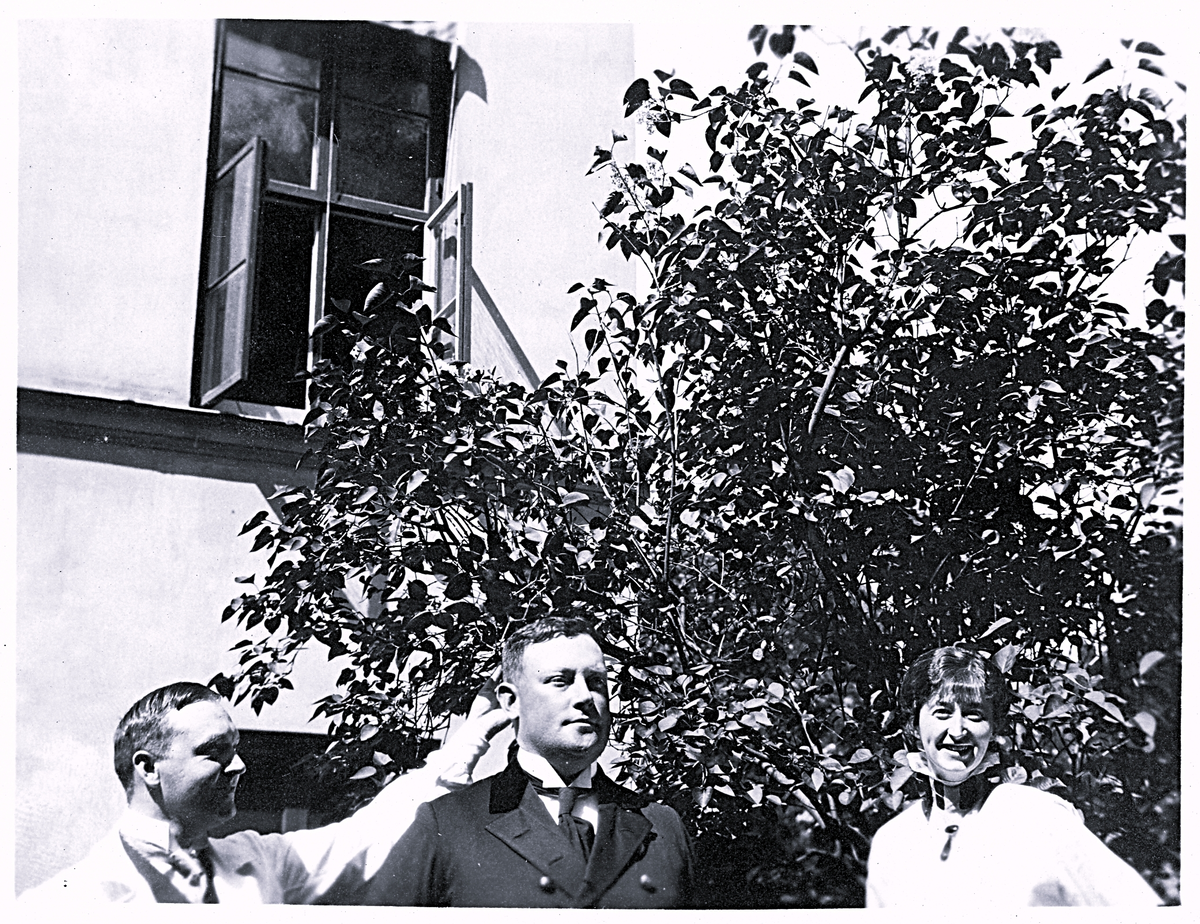 Foto av Ingrid Welander (f. Lagerholm) och två män i arbetskläder vid Sabbatsberg. Bildtext i album: "I det gröna vid Sabbatsberg 1916".