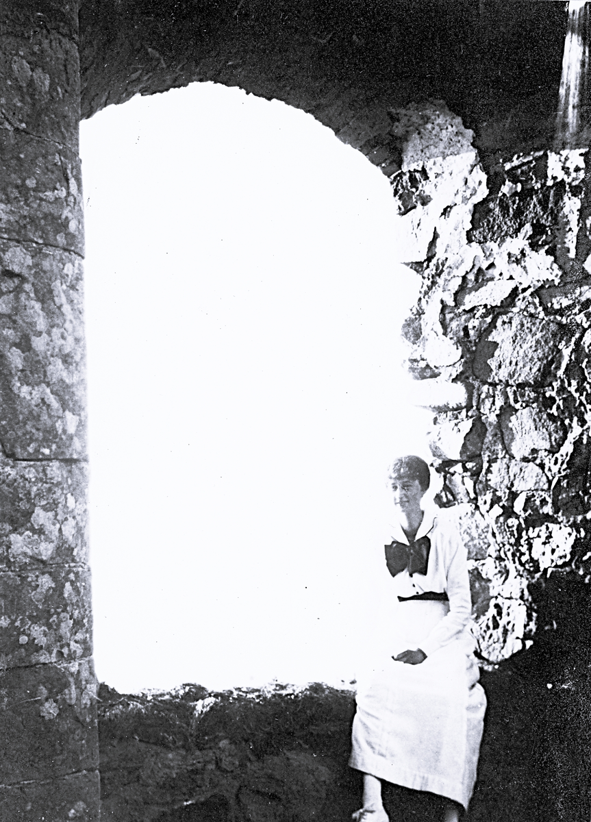 Titel: Foto av Ingrid Welander (f. Lagerholm) vid Brahehus, Gränna 1916 (enligt bildtext i album).