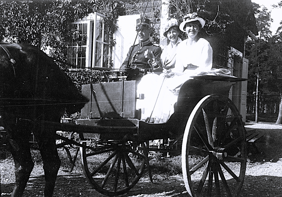 Foto av Ingrid Welander (f. Lagerholm) sittandes i mitten med en man och en kvinna vid sin sida i en vagn dragen av häst.