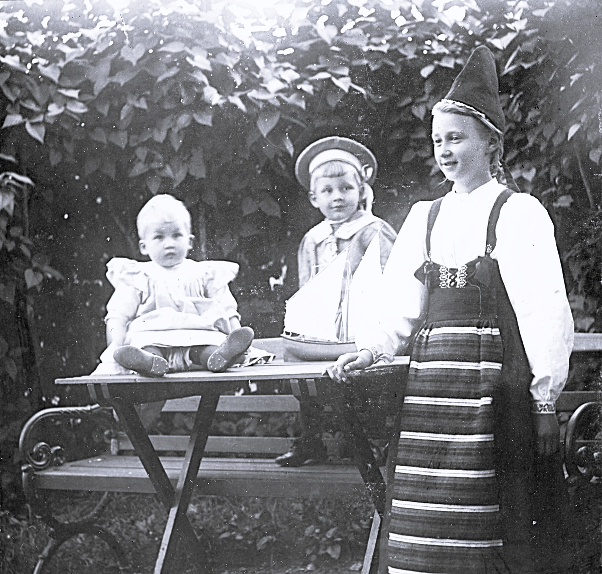 Foto av barnen Lagerholm fr v. Ellen, Harald och Ingrid i trädgården.
