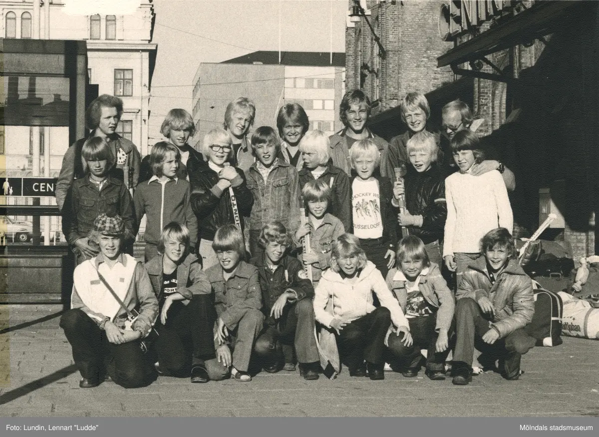 Grupporträtt av en samling pojkar från Mölndal som deltar i Busters ishockeyskola. Fotografi taget i Vallentuna sommaren 1975.