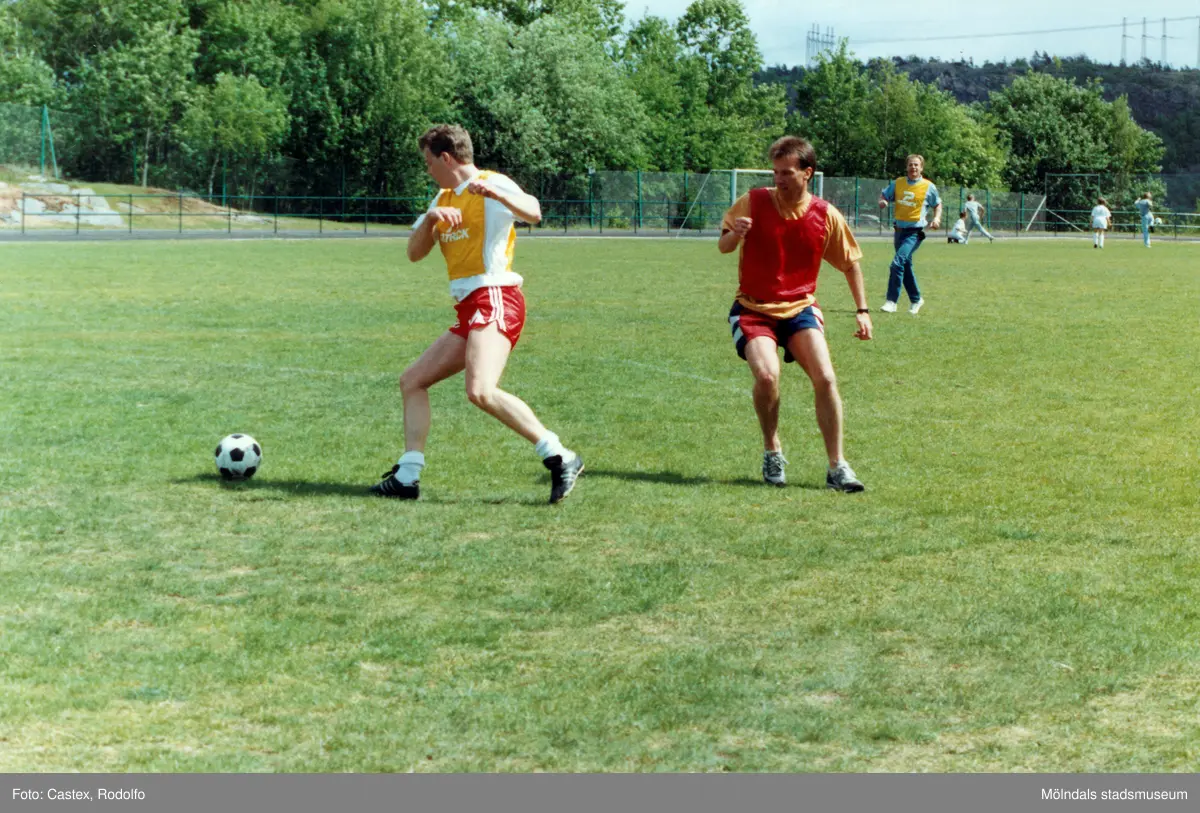Fotbollsmatch på Krokslättsvallen i Mölndal under Jitexdagen i juli 1991.