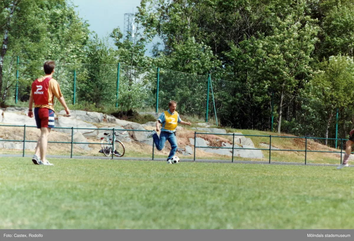 Titel: Fotbollsmatch på Krokslättsvallen i Mölndal under Jitexdagen i juli 1991.