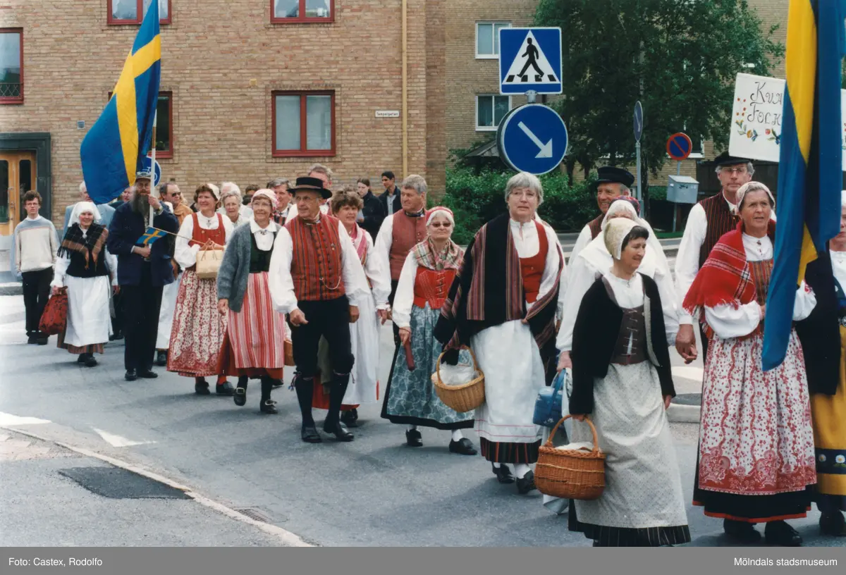 Nationaldagsfirande i Stadshusparken i Mölndal den 6 juni 1999. Här ses en samling människor iförda bygdedräkter tåga in på Häradsgatan.