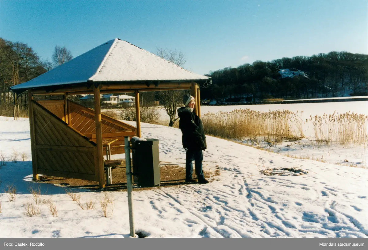 En kvinna står vid en rastplats intill Stensjön i Mölndal, januari 2000.