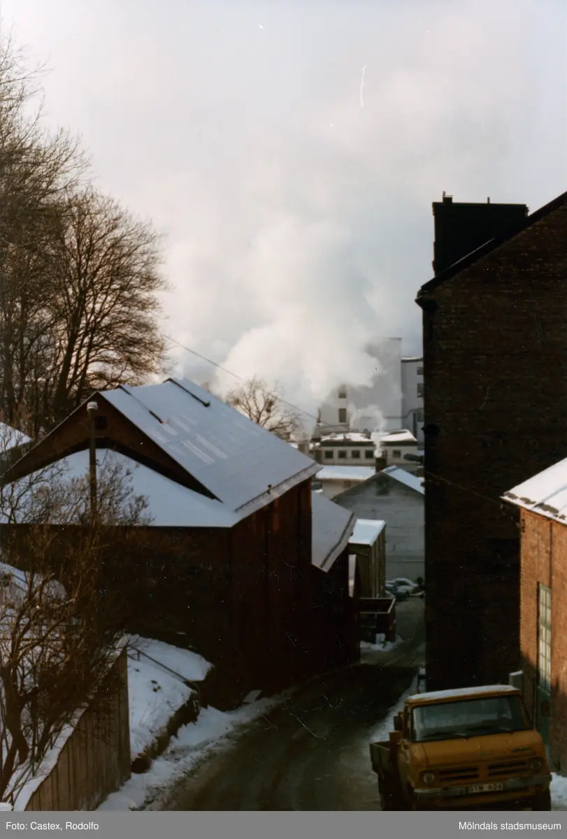Mölndals Kvarnby vintern 1985. Götaforsliden med intilliggande industribyggnader.