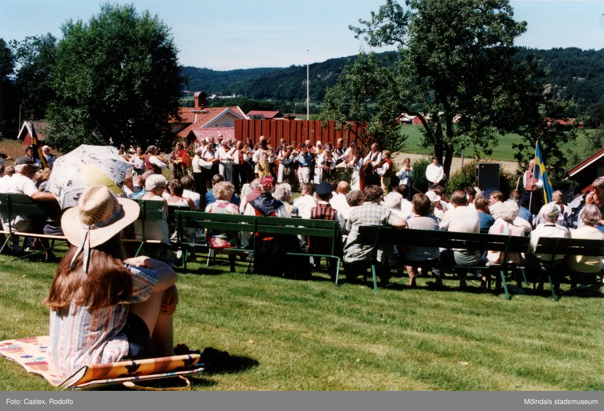 Ett spelmanslag uppträder inför publik på hembygdsgården Börjesgården i Hällesåker, Lindome, i Mölndals kommun, år 2001.